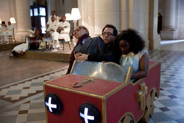 Von den ersten Minuten des Films an wird der Zuschauer in eine überschäumende Stimmung eingetaucht. Die Welt, die Michel Gondry erschaffen hat, ist voll mit Erfindungen (dazu zählen u.a. ein Cocktail-Klavier, eine Klingel mit Füssen und der Vorläufer des Internets), bizarren Phänomenen (die Beine der Tänzer strecken sich unverhältnismäßig, ein Zimmer wird rund, wenn die Musik von Duke Ellington gespielt wird, usw.) und weiteren lustigen Details. Das Gesamte ist visuell sehr effektiv und die Entdeckung dieser Welt – die Gondry selbst als „Retro-Futurismus“ bezeichnet – in der ersten Hälfte des Films macht Spaß. Die visuellen Effekte und der Bilderreichtum, die man als eine visuelle Übersetzung der blumigen und erfinderischen Sprache der Vorlage interpretieren kann, sind fast zu viel und machen es gleichzeitig amüsant und anstrengend, den Film zu sehen. Die Sprache erweitert diese besondere und chaotische Welt noch mehr. Wenn die Französischkurse aus der Schulzeit einige Spuren bei Euch hintergelassen haben, kann man nur empfehlen, den Film im Original zu sehen, um die sprachlichen Köstlichkeiten zu genießen: Wortspiele, Wortneuschöpfungen und Stil-Spiele sind zahlreich.