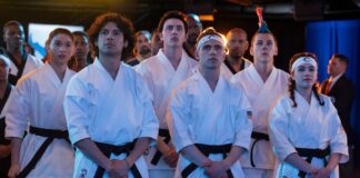 Neben dem Ankündigungsteaser, der kaum neue Szenen aus den kommenden Folgen zeigt, wurden auch die ersten offiziellen Fotos veröffentlicht, die mir zumindest mächtig Lust auf das große Finale machen. Nahezu alle zentralen Charaktere der Serie sind darauf zu sehen, Gut wie Böse. Sie bestätigen auch, dass der Sekai Taikai trotz des tödlichen Zwischenfalls am Ende des zweiten Teils der Staffel fortgesetzt wird. Kreese (Martin Kove) sieht man darauf mit einem blauen Auge, vermutlich noch von seinem Kampf mit Terry Silver (Thomas Ian Griffith); Tory (Peyton List) kämpft nach dem Tod ihres Co-Teamkapitäns Kwon (Brandon H. Lee) weiter für Cobra Kai; die Trainer und Kapitäne der Iron Dragons und des Miyagi-Do sind in kompletter Aufstellung mit von der Partie; und die ehemaligen Gegner Daniel LaRusso (Ralph Macchio) und Johnny Lawrence (William Zabka) üben scheinbar gemeinsam den ikonischen Crane Kick aus dem Finale des ersten Karate-Kid-Films: