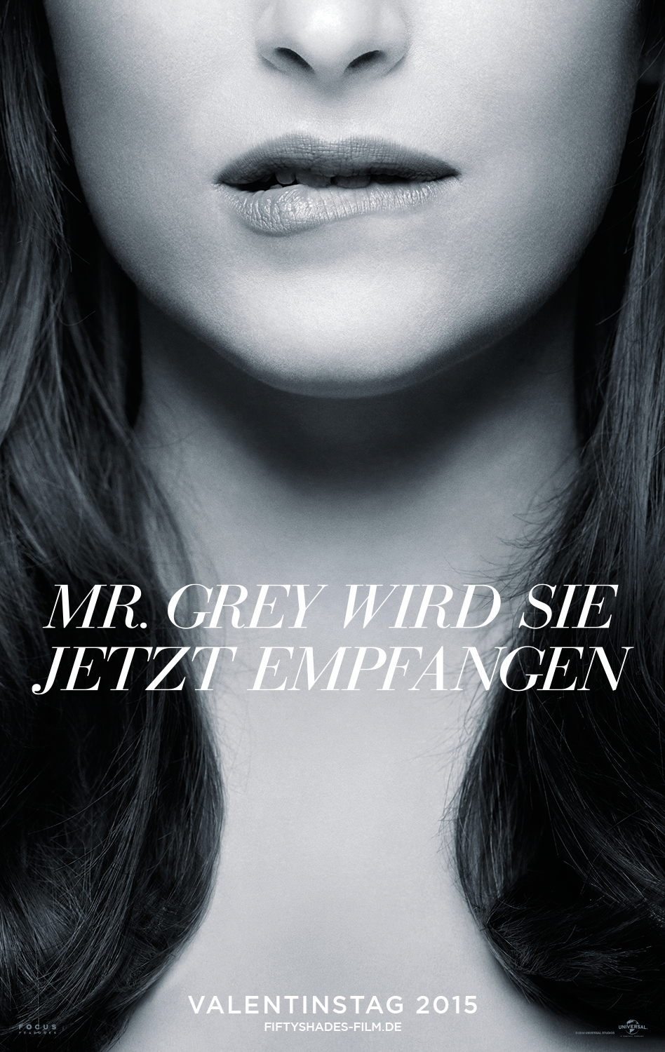 "Der größte globale Bestseller der letzten Jahre erzählt die Geschichte der 21-jährigen Studentin Anastasia Steele (Dakota Johnson, The Social Network, 21 Jump Street), die für ihre Universitätszeitung ein Interview mit dem 27-jährigen Milliardär Christian Grey (Jamie Dornan) führt. Grey tritt derart arrogant und anzüglich auf, dass sich die junge Frau völlig überrumpelt fühlt — ihr Fluchtimpuls weicht aber bald einer geheimen Faszination, der sie sich nicht entziehen kann. Unentrinnbar wird Anastasia in Greys Bann gezogen, der ihr eine ungeahnte Welt eröffnet." (Quelle: Universal Pictures Germany)