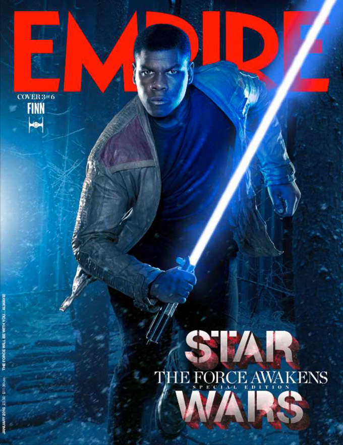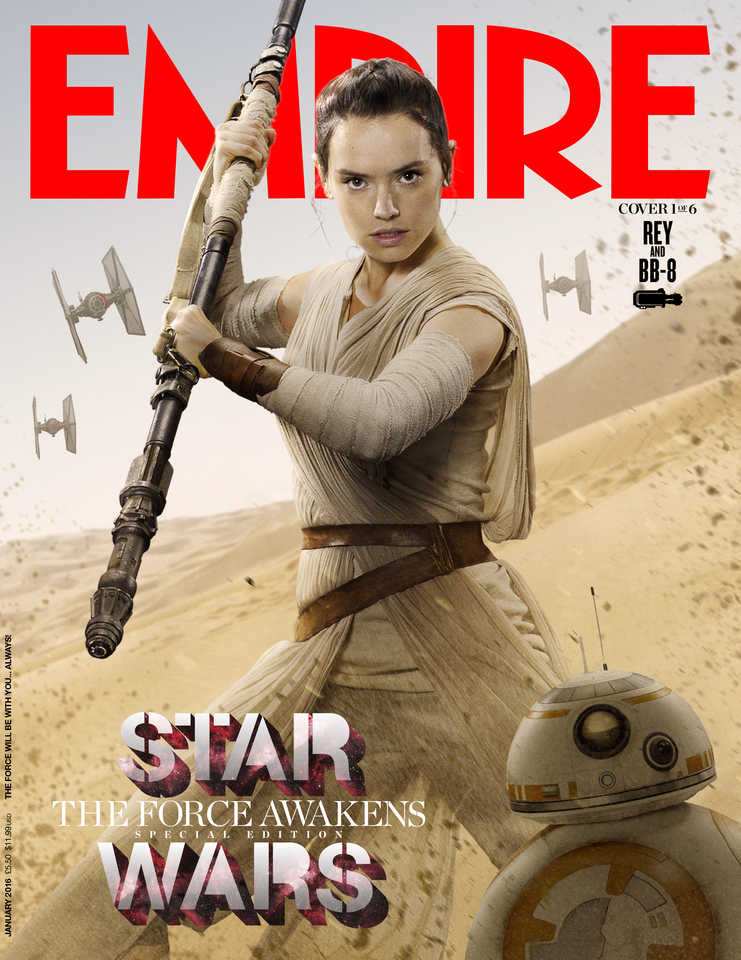 Doch wir wollen Euch auch nicht ohne neues Material zum Film entlassen. Die britische Filmzeitschrift "Empire" hat sieben exklusive Star-Wars-Cover veröffentlicht, die sich den verschiedenen Charakteren des Filsm widmen. Den Vorrang haben die neuen Figuren Poe Dameron (Oscar Isaac), Captain Phasma (Gwendoline Christie), Kylo Ren (Adam Driver), Finn (John Boyega) und Rey (Daisy Ridley) während Han und Chewie sowie R2D2 und C3PO sich jeweils ein Cover teilen. Man beachte besonders das amüsante Cover der beiden Droiden. Interessant ist, dass neben Luke (woran man ja längst gewohnt ist) auch Leia auf den Covern fehlt.