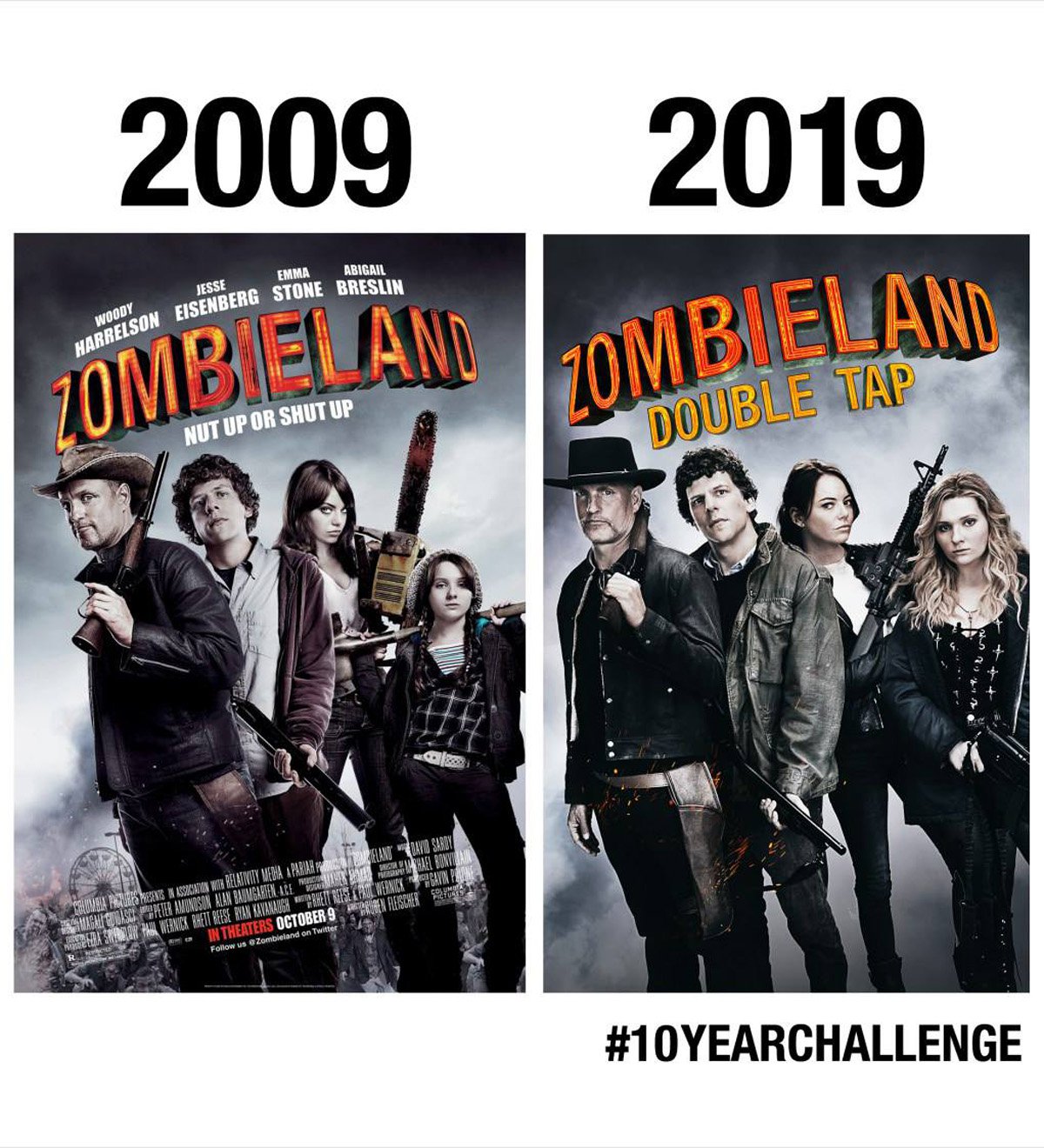 Kurz vor dem Drehstart hält Sony Pictures für die Fans einen ganz besonderen Leckerbissen bereit. Im Rahmen der aktuell so beliebten "10 Year Challenge" wurde ein brandneues Cast-Foto des Films mit den vier Hauptdarstellern Woody Harrelson, Jesse Eisenberg, Emma Stone und Abigail Breslin als Vergleich zum Poster des ersten Films veröffentlicht. Die größte Veränderung ist selbstverständlich bei Abigail Breslin zu verzeichnen, während Harrelson eigentlich ganz genau so aussieht wie damals: